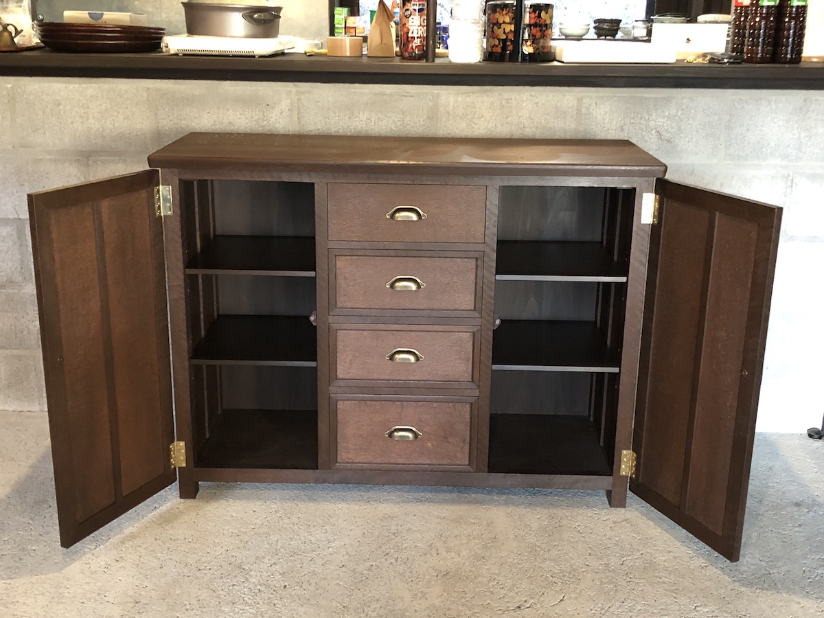 サイズは幅:1200mm、高さ:900、奥行き:450と良く使われる大きさ。 主材は岩手県産の楢。10年以上前に丸太買いして45mmと70mm厚の柾目で製材、自宅の材置き場で自然乾燥させていたものです。今では国産材の入手は困難になって来ていて貴重な材となりました。