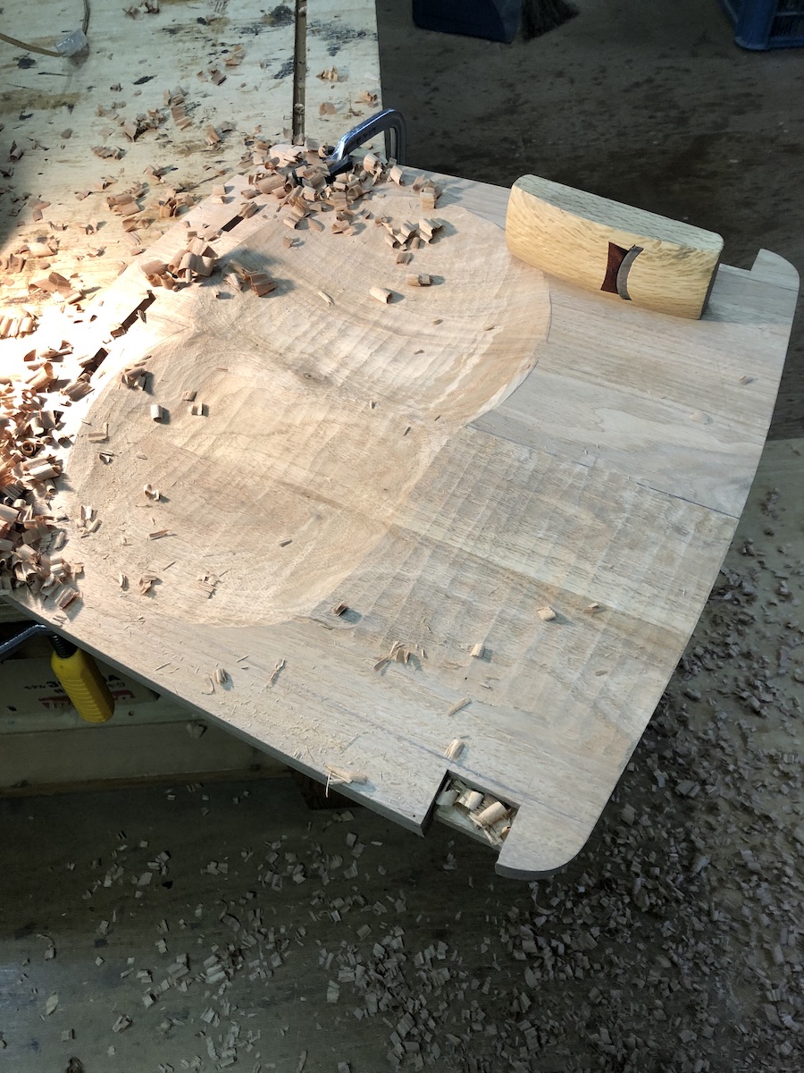 旧台では座刳りをする時、粗削りし小振りの四方反りで鉋枕を削るなどして仕上げていましたが、新調した四方反り、非常に調子が良い!目論見通りに刃口も程良く逆目ぼれもほとんど出ず鉋屑が詰まることもない。台のRも座刳りのRにピッタリ沿い、材に当たる刃の当たり具合を感覚で微妙に調整するストレスが大幅に改善され、この1台で仕上げまでこなすことが出来ました。ルーターを使ってみようか?!などと思うことが全く無くなりました。
